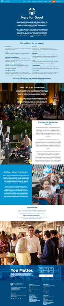 A good website always starts with inspiration and discussion. We looked to some other Jewish Federation websites to see how they approached these issues, and that was somewhat enlightening. We realized that we needed to look quite a bit further out into the nonprofit world to see examples of the solutions we were seeking. We took inspiration from Volunteers of America, The American Cancer Society, Project Rubicon, and others.