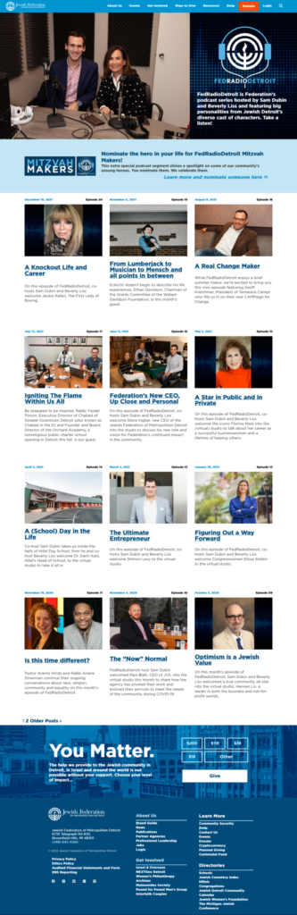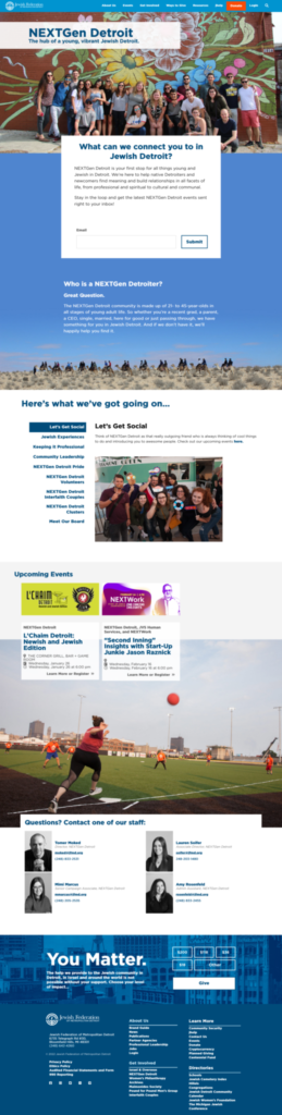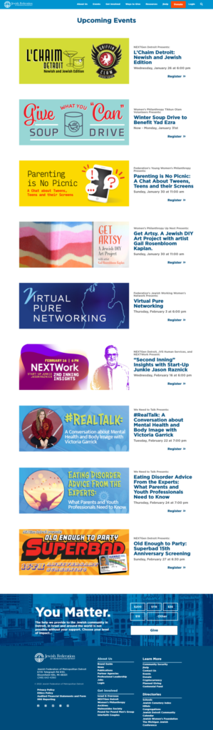 In my time with JFD, I learned a lot about the huge variety within the Jewish community. There’s a vast range of needs and priorities throughout the community and the Fed (as we affectionately call it) is supposed to encompass them all in one way or another. In light of that, we decided to divide up our audience by intention: people looking to donate, people looking for help, and people looking to get involved or attend an event. The puzzle of this project was streamlining those user flows while also giving the user ample opportunity to jump off that beaten path, explore, engage, and possibly find their community. It also had to visually represent the organization. The photos taken by our resident photographer were key here in helping people see themselves in our groups and at our events.