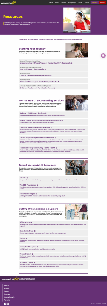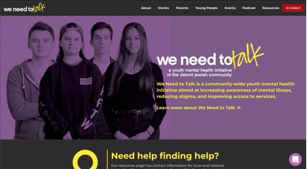 We did some good work here and I hope it helps a lot of people. We Need to Talk is a fairly comprehensive set of resources for teens in the Metro Detroit area, particularly in the Jewish community. Though, having gone through the content, this site is for everybody of all cultures and beliefs. Some things, like the struggles of being a teen, are just universal.